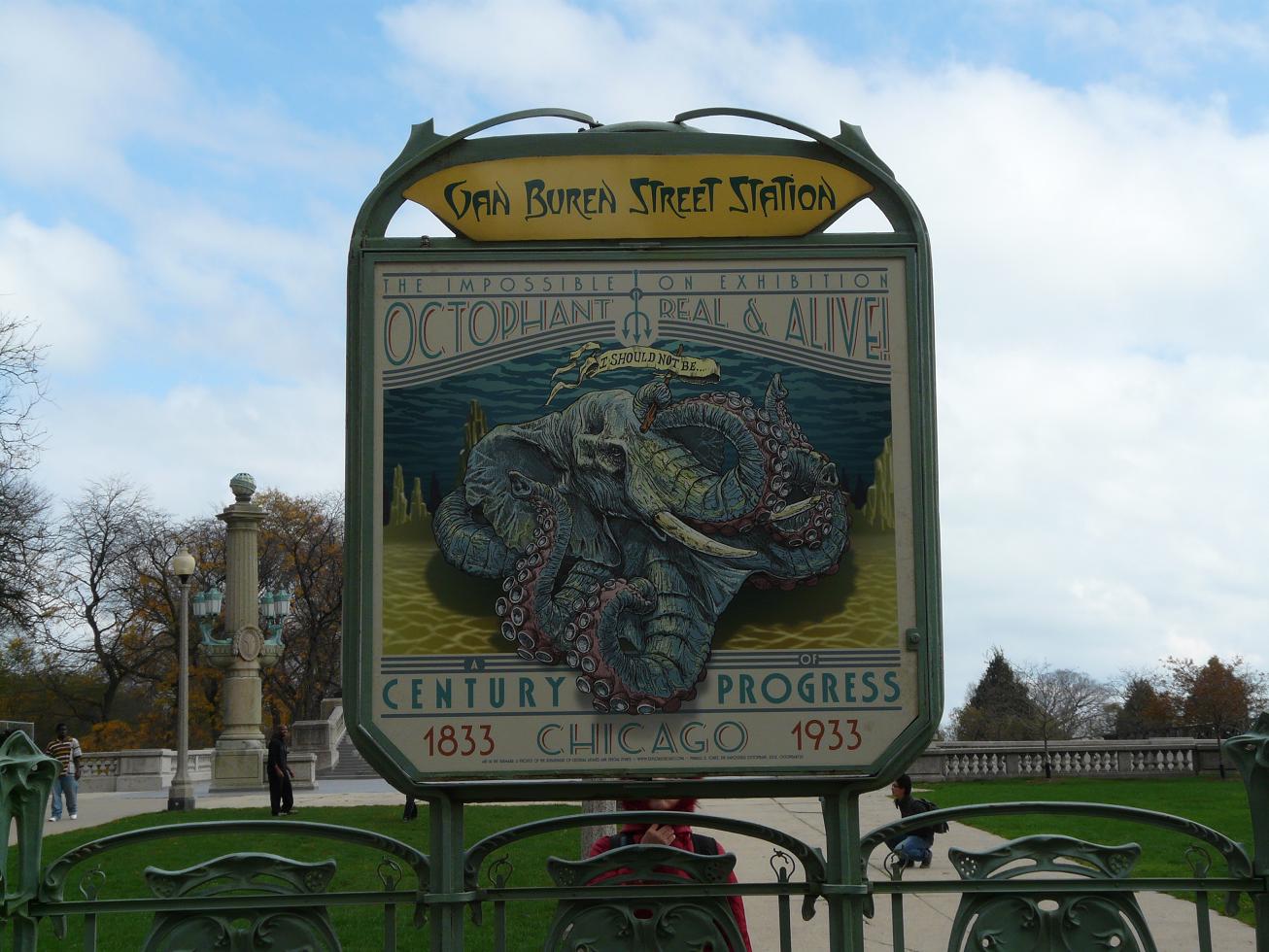 Так что же это была за история, какие она еще оставила следы и какой в ней смысл (если есть)? Ну, я расскажу, но давайте в поисках следов, как бесстрашные краеведы, с римской отвагой (С - Муссолини) пройдемся еще немного по городу. Вот что мы видим там рядом? Обычные вещи, ну. Типа вот слоносьминога рекламируют (3), реликт той самой всемирной выставки "Столетие прогресса" (1933), в связи с которой и появились описываемые здесь (в хорошем смысле) исторические памятники. Заметьте, это было до Фотошопа, но мысль в правильном направлении уже работала.