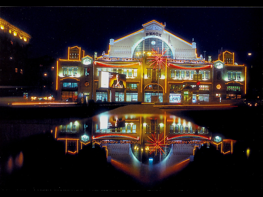 фото 5. Бессарабский рынок. Угол ул. Крещатик и бульвара Шевченко. ИМХО, интересный эффект отражения достигнут при помощи гранитной плиты у подножия памятника Ленину - точки, с которой был сделан снимок.