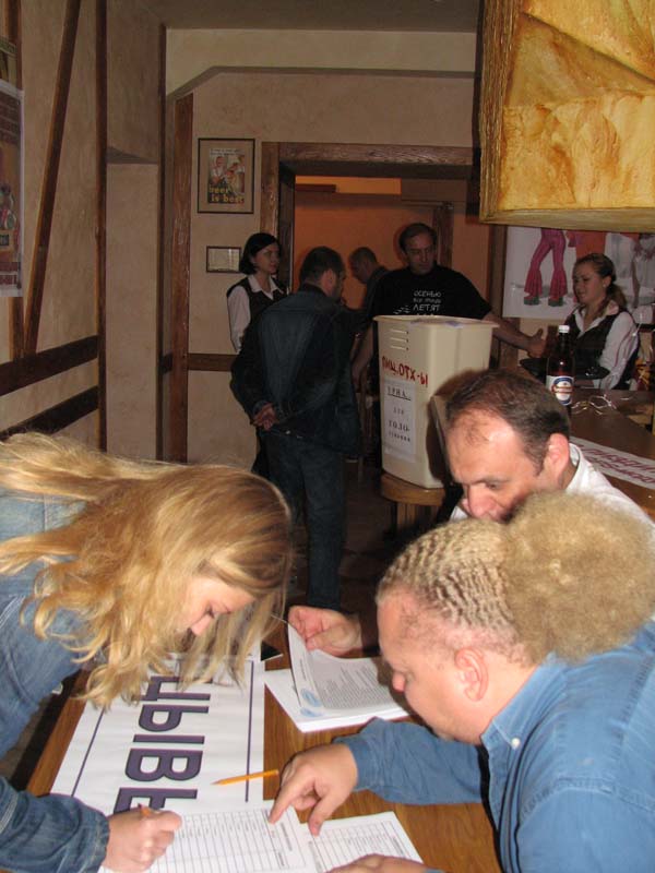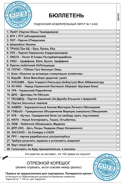 После опускания бюллетеня в урну каждого ждало 100 граммоф вотки и приглашение за празничный стол. Не смотря на ряд замечаний, выборы были признаны чесными, прозрачными и падонскими.