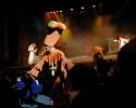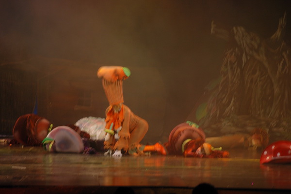 Пока бабка бродит по залу, одаривая зрителей нетленными строфами типа «Третий раз я здесь брожу, может, я по кругу хожу?» (фото 4), на сцене-ака-полянке насекомые будят грибы и пуляют в них мобильным фаллосом. Грибочки щемятся от него кто-куда (фото 5), а стильный мухомор-латинос отплясывает в это время джигу перед сросшимися бледными поганками. Всем заебись как весело, давай под шумок меняться шляпками, а потом и вовсе разбрасывать их по сцене (фото 6). Оказывается, не зря: вылезший из хрена на колесиках долговязый детина с соской потом еще долго примеряет все эти шляпки, пока не останавливает свой выбор на длинном поварском колпаке рыжего цвета (фото 7). Оставшиеся без шляпок грибы валяются между тем по сцене в расслабленных позах, как мужики после групповухи (фото 8), а сосочник жеманно виляя попкой лезет в зал и протягивает детишкам свои руки в белых перчатках (фото 9) – я тоже не удержался и ущипнул его за конечность, каюсь.