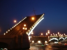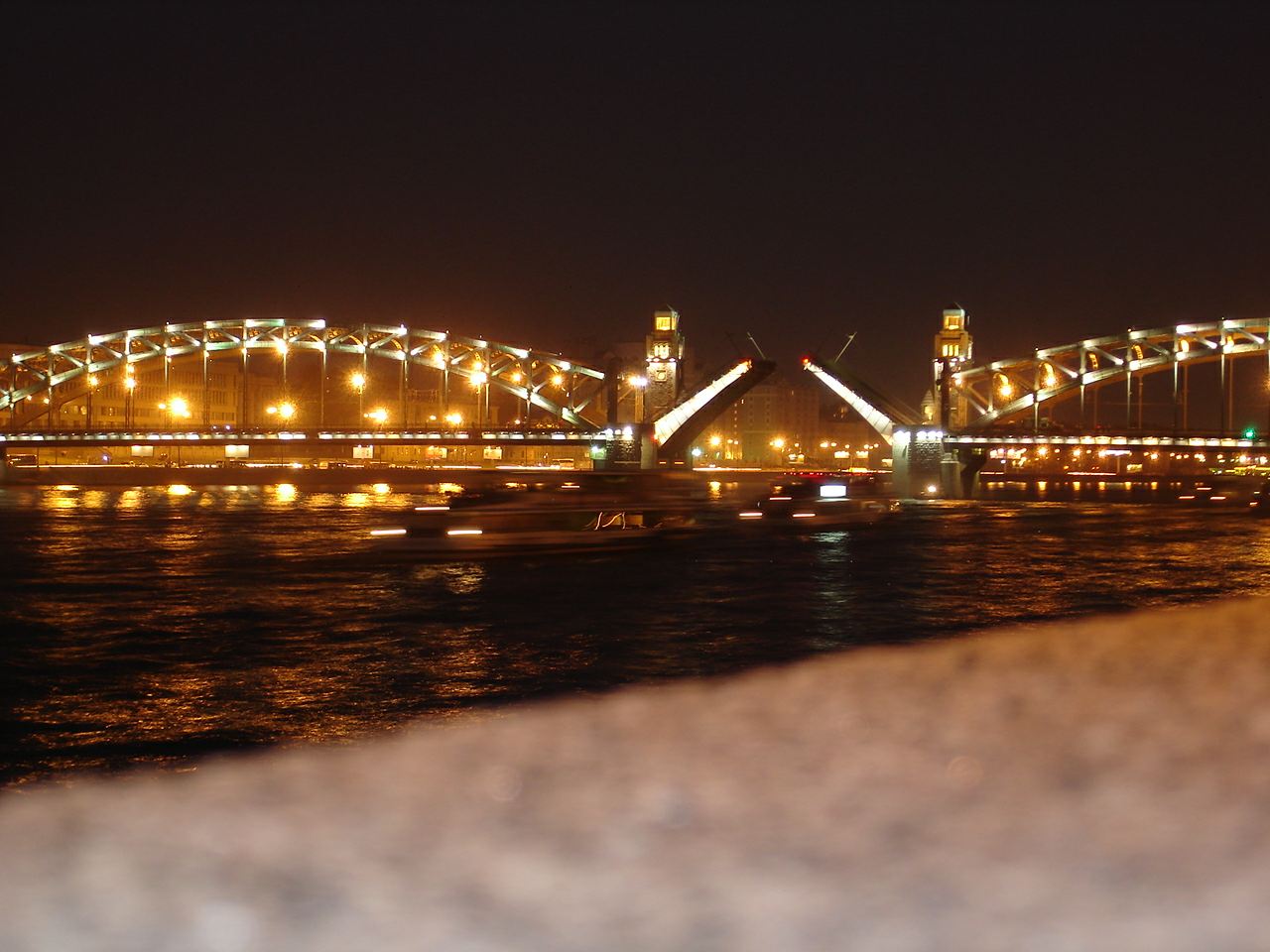 Там вышли из автобуса снова и ждали, пока начнет разводиться Дворцовый мост. Народищу!!! И на Неве в лодках и на берегу. Было уже далеко за полночь и стемнело, но прохлады ночь не принесла. Обратил внимание потом, когда ехали снова на автобусе, на одном электронном табло были цифры: время 02-10, температура + 27С. В общем мост развелся, затем к следующему мосту поехали быстро, и, таким образом, увидели, как развели то ли 5 то ли 6 мостов, я уже не помню точно. Я уже был уставший и когда в 03-00 нас повезли жрать в какое-то кафе, я говорю знакомой, типо, поехали отдыхать. Для интересующихся – ночная автобусная экскурсия по Питеру с разводом мостов с 23-00 до 05-00 – стоит 350 рублей.