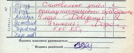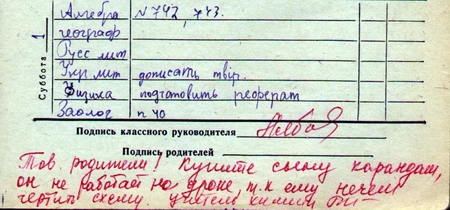 ахуительно, ага! У меня в днивнике за 4-й класс были паметки пакруче. "Ногами пачкал костюм соседу", "Отвратительно вёл себя на физзарядке", "Сидит на уроке и ничего не слышит (рисует)", "Дрался на перемене с Блинниковым Васей. Обижал Иру Шнайдер", и типа того, всего не упомнишь. Родителей просили купить: карандаш простой, карандаши цветные, альбом, спортивные шорты. Шорты были но я их не носил- щитал пидарскими, карандаши цветные ломал, штоп красить жывачки, из альбомных листов делал силитравые бомбачки, а карандаши простые как-то, хуйзнаит, праёбывал.........