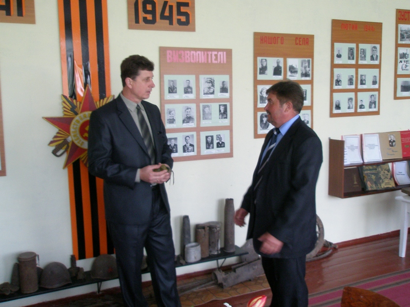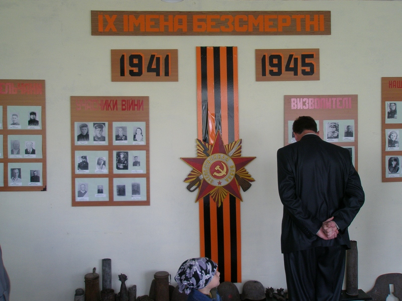 За братской могилой решением сельсовета закрепили местную единственную общеобразовательную школу, один из просторных кабинетов которой занимает музей освобождения села (фото №№10,11,12). Весь преподавательский состав принимает непосредственное участие в пополнении экспонатной базы, мы тоже привезли все документы, касающиеся моего деда (извещение, т.е. «похоронка», выписка из книги памяти, ответ военного комиссариата, увеличенное фото и т.д.).