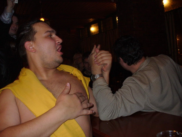 Мент рассказывал о нещасных блядях, мёрзнущих на улицах питера по 300 р за минет, плюс зажигалка на предварительный обогрев рта, Ебобат пошёл кого-то пиздить на улицу, а Осётр с Чингачгуком решили устроить мощщное хуемерялово, но почему-то остановились на идее армреслинга. Cоревнование завершилось триумфальной победой Чингачгука, ознаменовавшей превосходство массы над опытом…