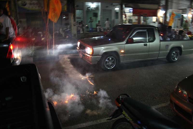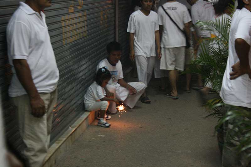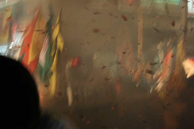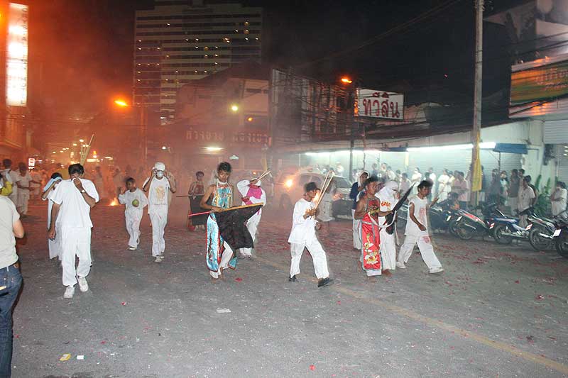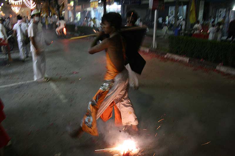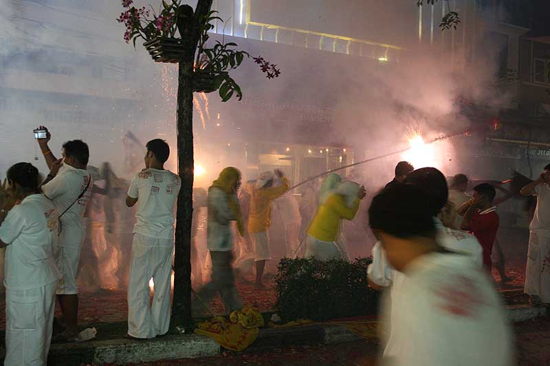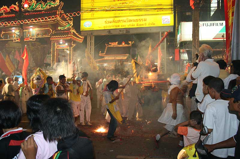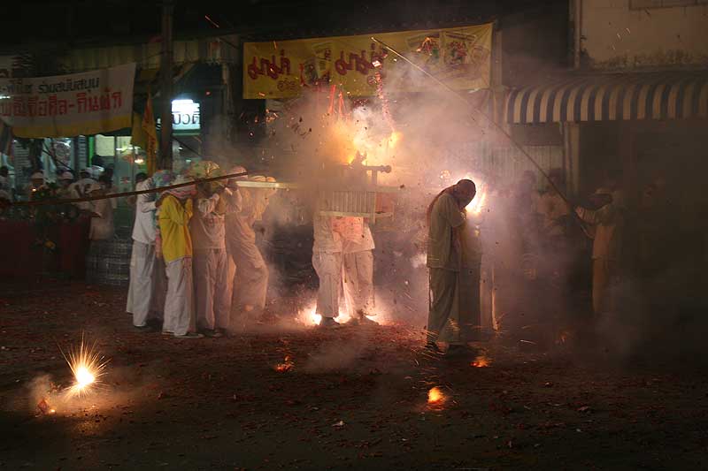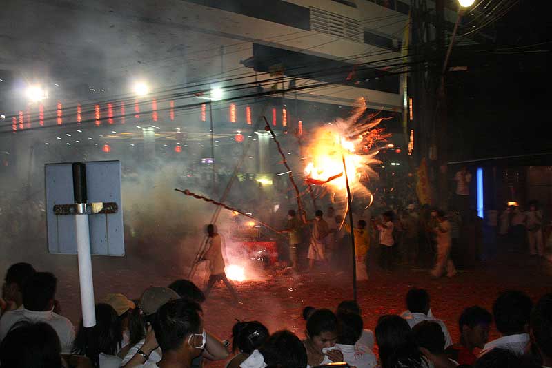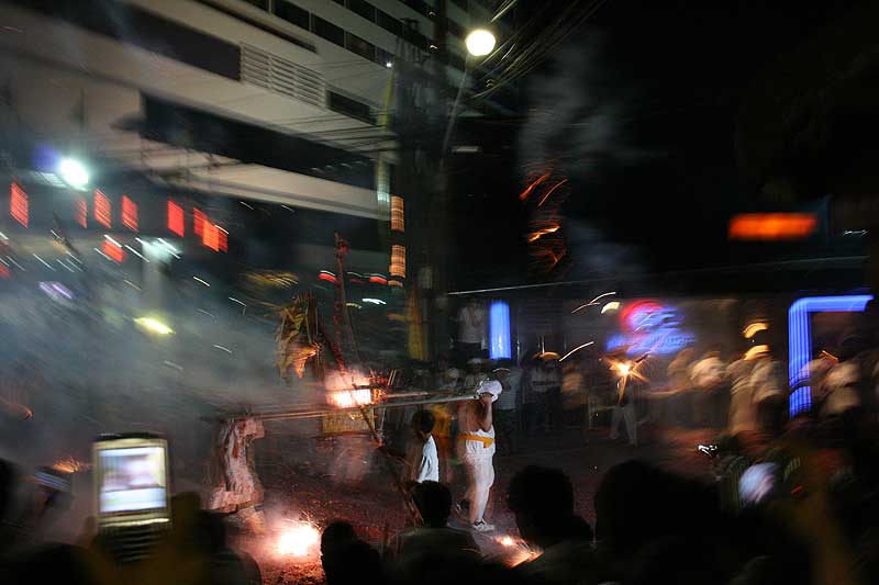 Кульминация фестиваля в этом году проходила в последний день, 19 октября, когда с закатом солнца на улицы высыпали все жители китайского квартала и участники всех предыдущих процессий. Снова все улицы квартала обносятся носилками с изображениями богов, снова Ма Сонг, тряся головами и бормоча в трансе тарабарщину, благословляют толпы верующих. И снова, но теперь уже в разы больше – бой барабанов и тысячи, миллионы петард.