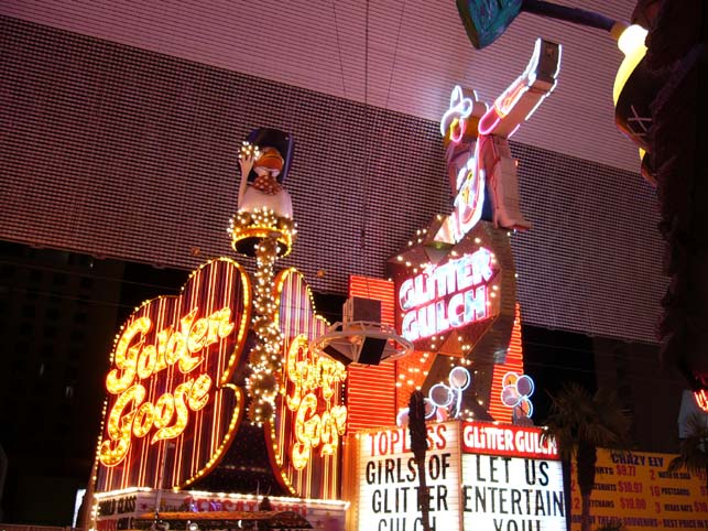 На Фремонт стрит же распалагаютца 2 висьма адиозных стрип клуба: «Залатой гусь» и «Свиркающая пропасть» (я так пиривел). Ани ниасобо навароченные и гламурные, но их имблемы не приминут паказать чють ли не в любом фильме про Вегас. Внутри прикольно, полутемно, пракурено - атмасфера бля как в омериканцких фильмах-абычно ф такое заведение приходит каконибуть палажительный пирсанаж и фсех пиздит нахуй. Девочки есть очень даже. Фсио как полаген, сидишь блиско – изволь денешки за резиночнку трусоф засунуть, тада ап тибя сиськами патруцца и будут валяцца на стале изабражая страсть. Американтсы канечно еще те ибанько – ходят в стрип клупп с жонами, сваими пелотками, чють ли не с детьми - туристы бля. Забавно, адин мой знакомый американетс выпиф пару бутылочег Миллера арал: «Да ани ахуэли! Приват танетс за 40 баксоф! Да у нас в Нюйорке атсасут за эти деньги иниибет!» Такие вот кантрасты, ебаный американцкий рот.