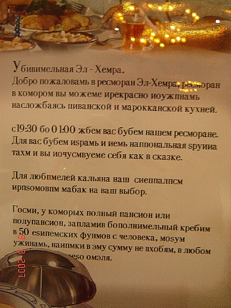 Спасибо , Афтар ! Редко от какого крео такой ржач пробивает. " Эл - Хемра " , судя по всему , аццкая восточная сказка ! Представляю , как там " госми " прутся от " тахма " и " мабака " , а если ещё и со " жбём вас бубем " не наёбывают , так не жалко 50 не только " esипемских фумнов " отстегнуть , " насложбаясь " по полной.