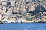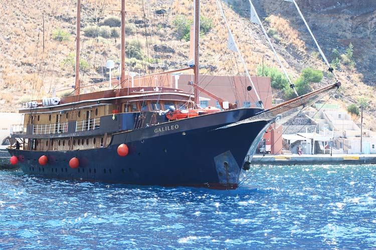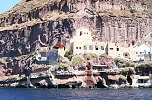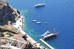 Поутру, выйдя из каюты на балкон выкурить первую утрешнюю сигаретку, узрел забавную картинку - город, сползающий с вершины отвесной трёхсотметровой скалы, напоминающий ледник на вершине горы. Порт же Санторини крохотный и не приспособлен принимать суда такого размера, как наше. Поэтому, как ранее на Корфу, наш лайнер встал на рейде, и желающих посетить остров вывозили на небольших катерах. Но на этот раз использовались не штатные шлюпки с моторами, а три местных прогулочных катера, непрерывно курсирующих между лайнером и портом до момента высадки всех желающих на берег.