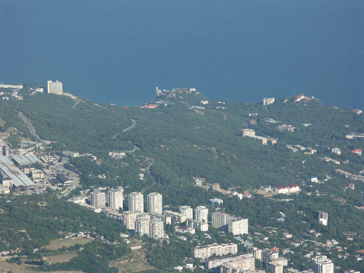 На юге от морского берега в горы поднимаются белоснежные дома красавицы Ялты. С вершины массива в ясный день отчётливо видны посёлки Гаспра, Ореанда, Форос, Кореиз, Симеиза, Голубой залив, город Алупка? На западе, в Байдарской долине, лежат сёла Орлиное, Подгорное, Родниковое, Россошанка, Новобобровское, Передовое? У подножия северных склонов в густых садах, смыкающихся с лесом, с трудом можно разглядеть сёла Поляну, Соколиное, Многоречье, Счастливое? И только на востоке, где Ай-Петри граничит с другим горным массивом ? Ялтинским, селений нет.