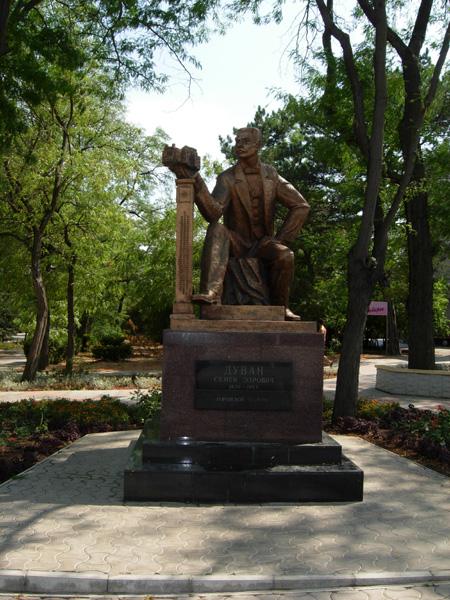23.Памятник Семёну Эзровичу Дувану. Это был состоятельный и прагматичный караим, купец первой гильдии, крупный землевладелец. Дувана несколько раз избирали на должность городского головы. Почти всё, что на рубеже XIX —XX вв. появилось в Евпатории хорошего и интересного, обязано своему возникновению трудам господина Дувана.(Библиотека им. А.С. Пушкина, Гор театр, Храм Св.Илии)