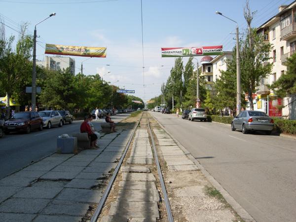 34.Одноколейная трамвайная дорога к ж/д вокзалу, для тех кто в танке - поясняю, что на конечной остановке вагоновожатый переходит в кабину другого конца трамвая. В Евпатории расположено единственное трамвайное депо в Крыму.