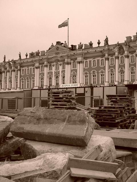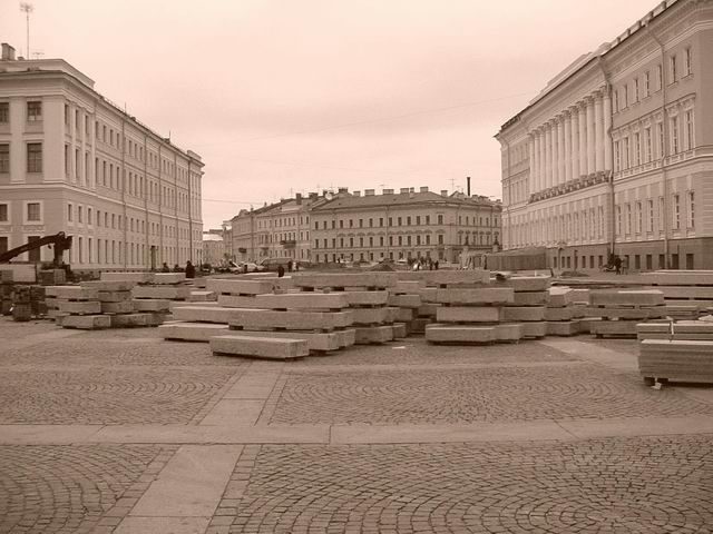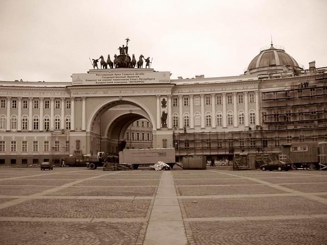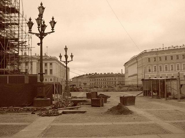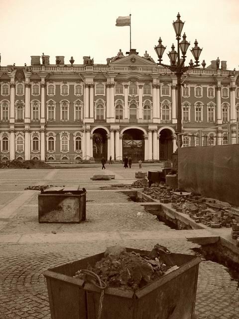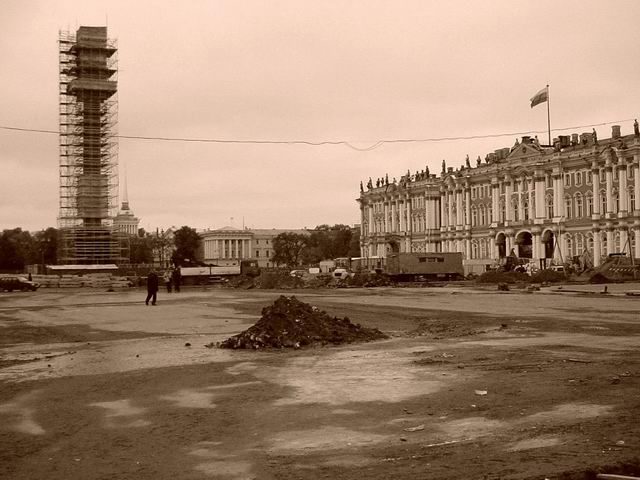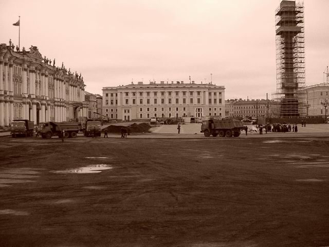 Я здесь вижу сиюминутное состояние дварцовай площади, леса, вагончики и всякую другую хуйню, типа