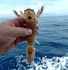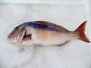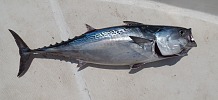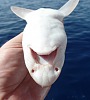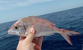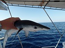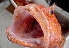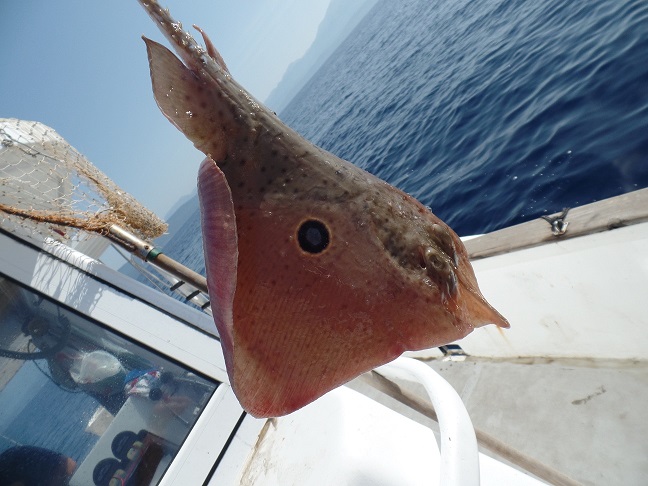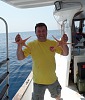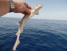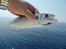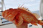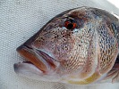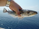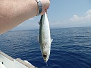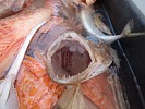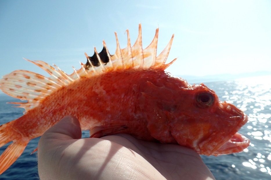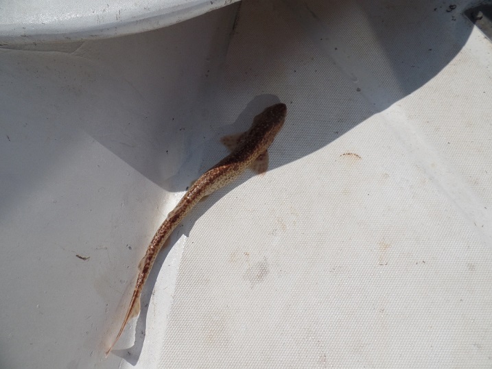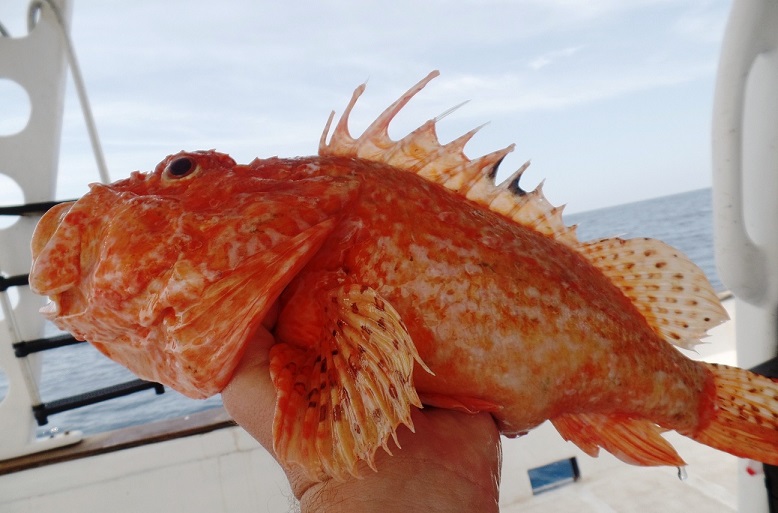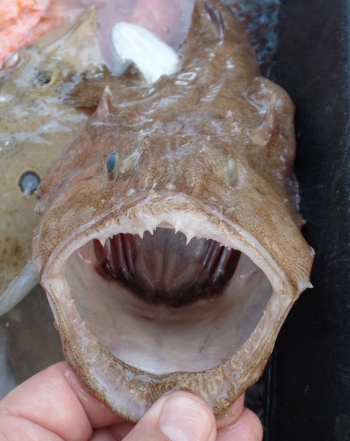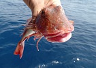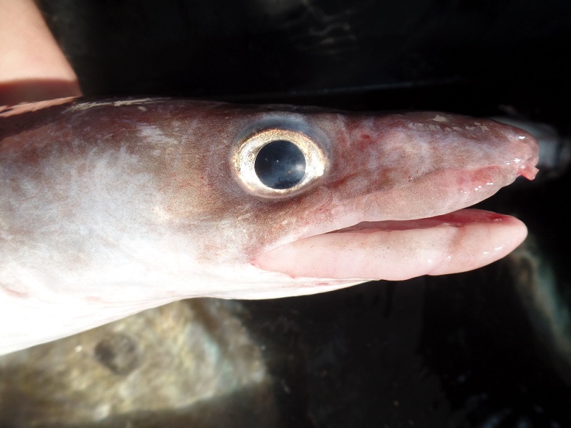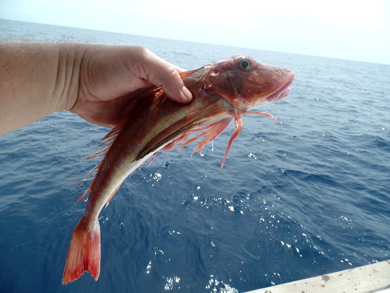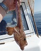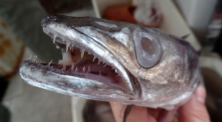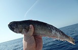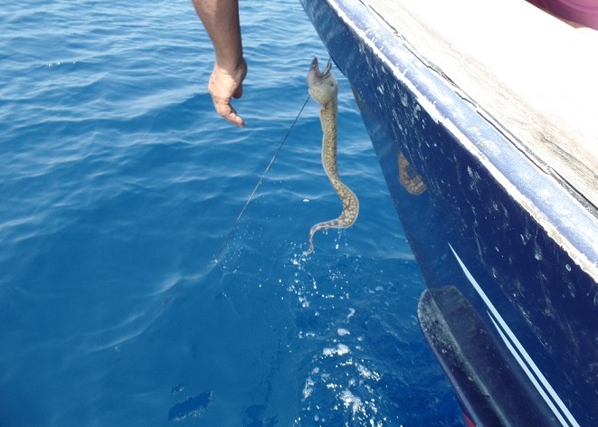 Под поверхностью это метров 10 - 20. Мы ставили на шнур каждые примерно 200 метров поплавки с верёвкой и карабином, чтобы шнур не тонул. А на дно раз поставили на крючки поменьше, двадцатку, так там только синий тунец взял и зубатка (фото 17), она летом только на глубине. На сам шнур и поводки идёт леска ниибаццо толстая. По краям шнура идут якоря на дно, чтобы его не унесло за ночь нахуй.