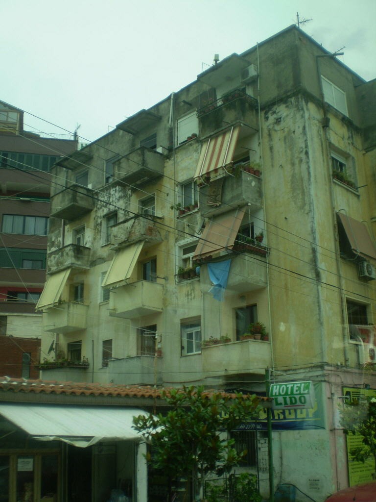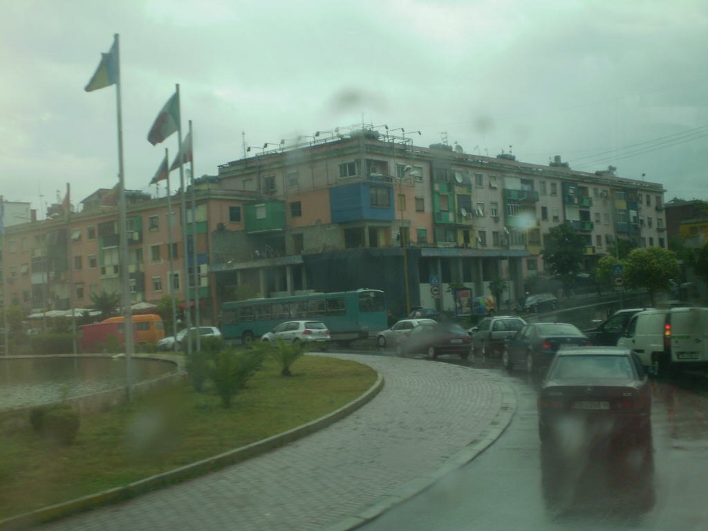 Дальше дорога (как сообщила гид, построенная 10 лет назад – до этого ее просто не было) пошла вдоль сильно разлившейся речки под названием Бояна (не путать с бояном). С левой стороны были замечены знаменитые олбанскее бункиры-доты, построенные во времена, когда олбанскей лидер Энвер Хаджа сначала дружил со Сталиным, а потом разосрался с Хрущевым (наверное, не любил кукурузу). Сфотографировать бункиры не получилось из-за усилившегося ливня. 20 минут по узкой дороге вдоль реки – и вот мы уже въизжаем через никакущий мост без перил (но рядом строецца новый) в город Шкодер, каторый начинаецца с грязных цыганских трущоб (фото номер 3). В Шкодере нас привезли на центральную площадь и высадили из афтобуса пофтыкать 15 минут на окружифшую нас со всех старон мрачную олбанскую действитильнасть, еще и, для полноты картины, окропляемую дождем и обрамленную серыме свинцовыме тучаме. Дальше мимо крепости Розафа, каторай типо 27 веков, мы поехали дальше на юг, в сторону столицы Олбанее города Тираны и портового города Дуррес. Дорога Шкодер-Тирана местами очень сильно напоменает дорогу Бендеры-Кишинев, толька вместа малдаффских халмов в Олбанее имеюцца небольшие такие себе горы. Да и еще, дарогу активно ремонтируют, постепенно превращая ее в добротный читырехпалосный афтобан. В Малдавее о таком могут только мечтать. Вдоль дороги через каждые несколько киламетрав располагаецца небольшая оккуратная афтосвалка, преимущественно састаящая из 20-летних «мерседесов», каторые кстате саставляют 95 процентов всево олбанскава афтапарка. Наш водила притармазил около одной из них и пошел торговацца насчет фары к «глазастику» (на каком языке ? – спросите вы. конечно же, на олбанском !). Гид между тем рассказывала о стране. Милеон олбанцев живут в Италее, полмилеона - в Грецее, столько же или даже больше (никто не щетал) в столице страны Тиране – и здесь ситуацея один в один повторяет Малдавею, токо там в роли Грецее пажалуй что Россия выступает! Среднее зарплато в Олбанее – 150 евро. Снова в кассу ! Основные сельскохозяйственные культуры – памидоры для внутреннево потребления и ганджубас на экспорт. Надо же, и здесь все удивительным образом сходицца ! Жаль толька, што граждани Малдавее и Олбанее лишены возможности посещать друг друга без виз, при этом ведь еще и не панятна, где им искать посольства друг друга. Они бы по достоинству оценили такой туризм – вроде бы и за границей, а ведь всё как дома ! Так как я не являюсь щасливым абладатилем синево малдафскава паспарта, мне немного повезло в этом смысле. Впрочим, аставем в пакое Малдавею, у нас тут по ней Черный Аббат специалезируиццо недурно. В Дурресе уже вофсю светило сонце, нас провезли мимо порта на активно реконструируемую набережную, где мы прогулялись полчаса и пофтыкали на неслабый шторм на Адриатике. После чего уже по законченному настоящему афтобану, построенному по случаю недавнево вступления Олбанее в НАТО, быстренька поехали в столицу – город Тирана, который по-олбанске называецца не Тирана, а Тиране. Сама Олбанея, кстати, для внутреннего употребления почему-то называет себя вовсе не Олбанея, а Шкиперия (фото номер 9). В Тиране автобус высадил нас недалеко от центральной площади имени Скендербега. Скендербег – это такой олбанскей дедужко Ленин образца XV века, в честь него названы улицы, учебные заведения 