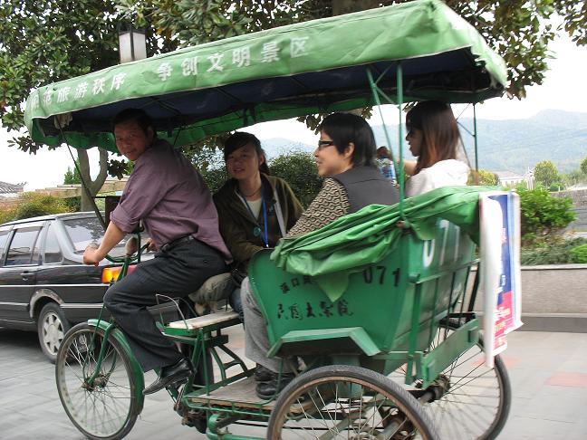 Много велорикш. Впервые за всё время в Китае покатался на таком. Был трезв и испытывал чувство неловкости за эксплуатацию человека человеком. Рикша кряхтел, крутя педали, и всё оглядывался. Потом сказал, что легче трёх китайцев возить, чем меня одного.