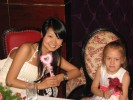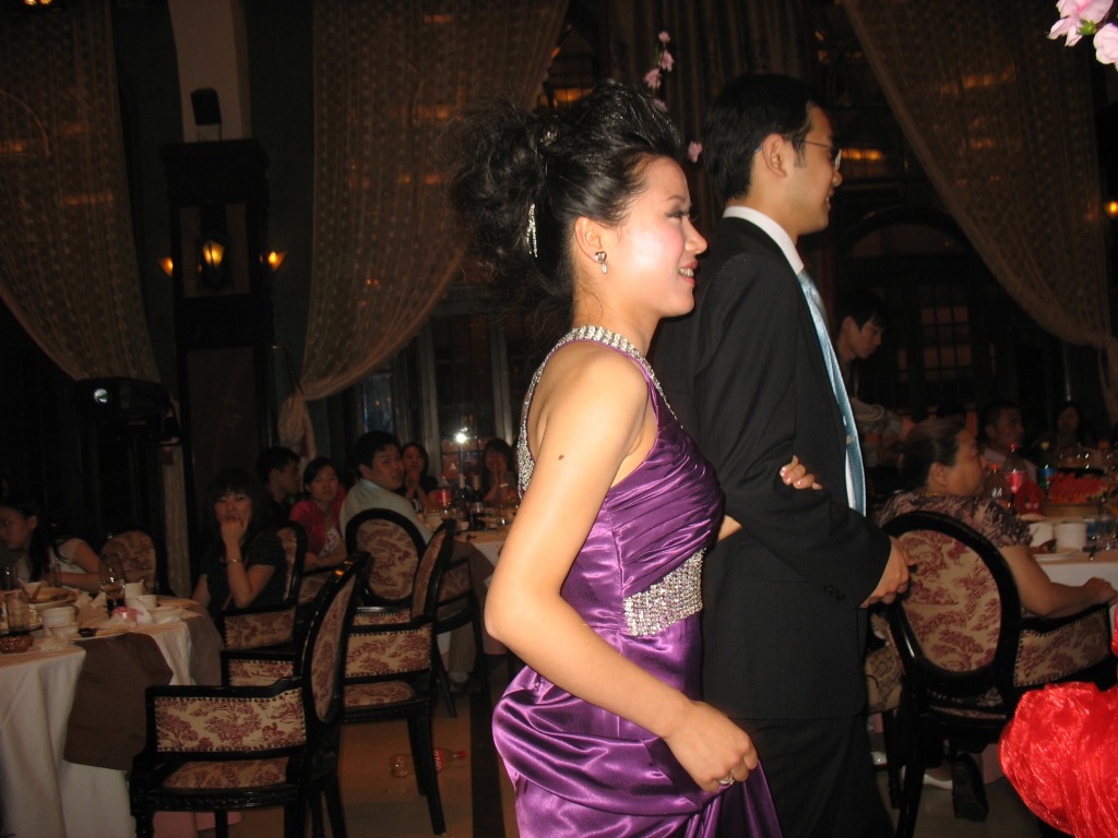 Невеста встречала гостей в белом платье, потом, по традиции, выходила в зал, переодевшись в красное национальное платье «ципао», и еще переодевалась в сиреневое, и опять в белое, но в другое уже, не то, что прежде было на ней.