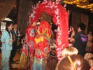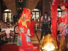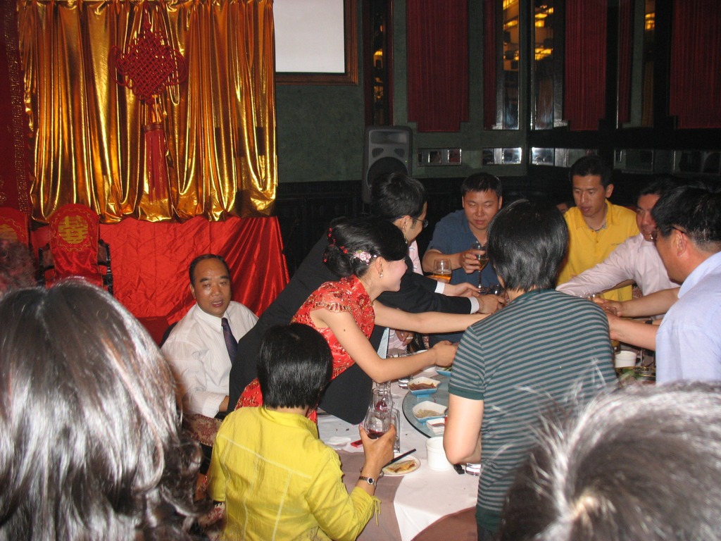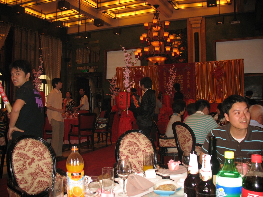 Хм... я соврал немного. На китайской свадьбе не пляшут и почти не поют. Гости собираются в ресторане, дарят подарки (чаще всего деньги в красном конверте, четную сумму – ведь деньги «на двоих»), рассаживаются за столами, и много кушают. Почти не пьют – сами видите, на столах – бутылка вина, два-три пива, спрайт-кола-сок. За столом обычно человек восемь. Потом невеста еще приносила на каждый стол по кувшинчику «байцзю» - китайской водки, но никто не пил, кажется.