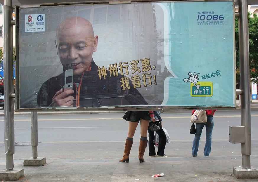 9510603На картинке, где женские ноги за остановко транспорта с рекламой сотового, три нижних иероглифа: "Мне - подойдёт".