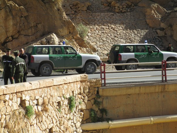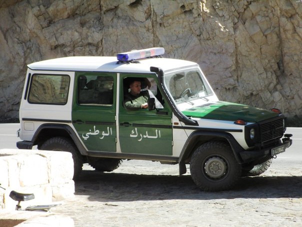 Следующее, что бросается в глаза – огромное количество вооруженных людей в форме на улицах. В столице на основных дорогах через определенное расстояние стоят блокпосты, оборудованные специальными приборами, определяющими наличие взрывчатки в салоне, вокруг блокпостов – полиция с автоматами. В Алжире полномочия силовых структур несколько отличаются от Украины. В городах за порядком следят полицейские в синей форме, немного похожей на украинскую. Большинство из них вооружены только рацией, но на всем посту обязательно будет один или два автоматчика. Однако вне крупных городов, где влияние и контроль правительства ослабевает, за порядком следят специальные подразделения – жандармы, облаченные в зеленую форму и обязательно вооруженные. Большая часть теми же автоматами, изредка встречаются пистолеты, предположительно, у офицеров. Жандармы также разделяют функции пограничников. По мимо полиции и жандармерии, в стране существуют также собственно вооруженные силы. Однако охраной границ и безопастностью на территории государства они не занимаются.