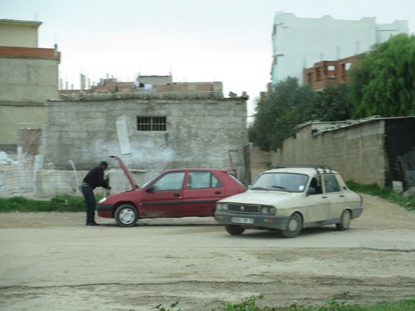 Вместе с тем, цены на автомобили и недвижимость в Алжире на уровне украинских, а точнее – киевских. Уже упомянутый представитель университета отметил, что, к примеру «форд фиеста» стоит около 12000 евро, «рено клио» – 10000. Однако не самая низкая стоимость автомобилей компенсируется смешной ценой на все виды топлива – дизель стоит меньше 2х гривен за литр, самый дорогой бензин обойдется примерно в 2.30-2.50 грн за литр. Как говорят местные, «дешевле, чем вода». Кроме того, здесь никто не заморачивается по поводу состояния автомобилей, так как это делают в Украине. Страховыми являются только те случаи, когда есть человеческие жертвы. Соответственно, всяческие потертости, царапины, вмятины, ржавчина или отсутствие небольших частей кузова здесь в порядке вещей. Кроме того, в случае мелкого ДТП никто не будет требовать возмещения ущерба или даже выяснять отношения. «Хвала Аллаху, что живы остались» — как правило водители ограничиваются подобными фразами и разъезжаются восвояси. ДТП, кстати, по словам представителя украинского посольства, встречаются очень и очень часто, цитирую «Тут існує так зване правило правої руки. Хто перший підняв долонь у знак того, що він збирається їхати – у того і перевага», «Рух дуже інтенсивний, але краще тримати якомога меншу дистанцію, щоб пішоходи не перебігали дорогу перед автомобілем». А они таки перебегают. Но наиболее интересное зрелище, это, конечно, перекрестки и дороги с круговым движением – по какому принципу определяется приоритет проезда, одному Аллаху известно. На некоторых узких улочках с явно односторонним движением машины ездят как попало, по принципу «Встречная полоса всегда соседняя с той, где в данный момент еду я». Хотя подобные казусы характерны, конечно, не для столицы – в основном речь идет о маленьких городах. Забыл отметить, что логичным следствием французского влияния на Алжир является огромное количество машин французского производства – Renault и Peugeot здесь, как в Украине чери, дэу и вазы. Или как в странах Персидского залива – тойоты и нисаны.