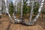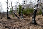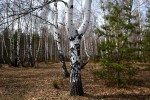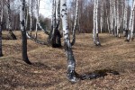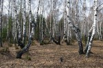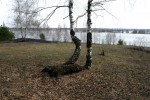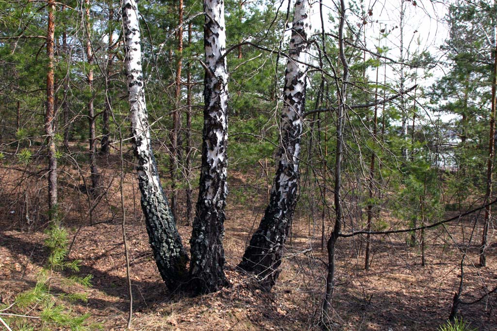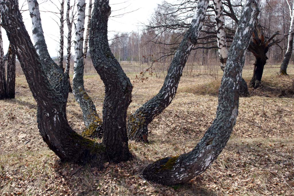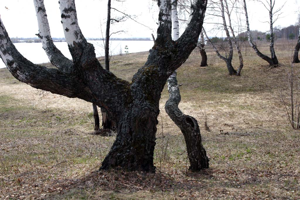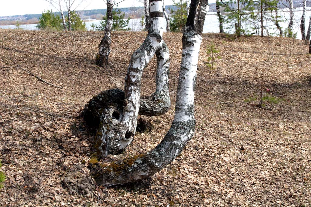 Березы на берегу раскорячились оттого, что берег песчаный, почва тощая, и раз в несколько лет, при большом разливе деревья уродуют льдины, а уроды в лесу бывают когда дерево растет точно на месте предыдущего, голодает, полшага в сторону и было-бы обычным.