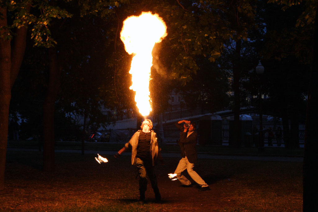 Добрый день, товарищи-камрады. Снова вылез с фотоаппаратом из дома. Нашел огонь, много огня и запах керосина. Это была Болотная площадь в Москве, одно из традиционных мест сбора так называемых файерщиков. Место где любят пои.