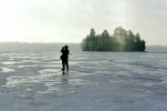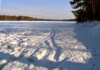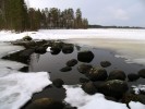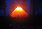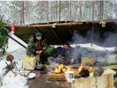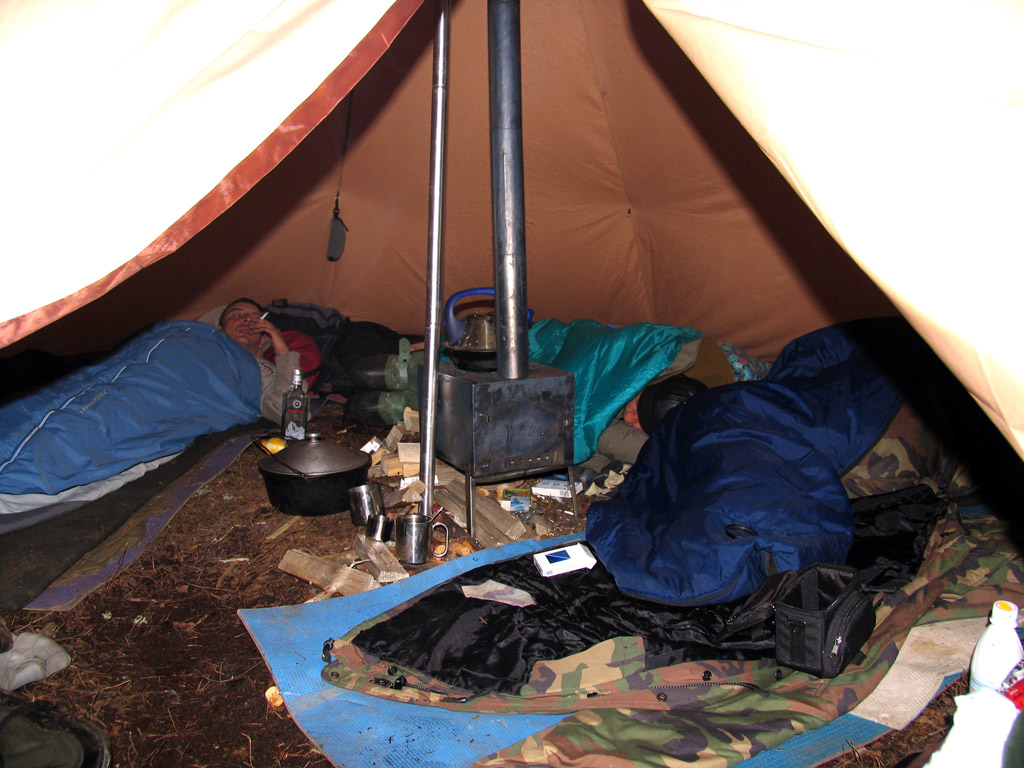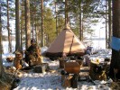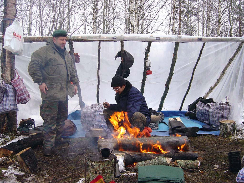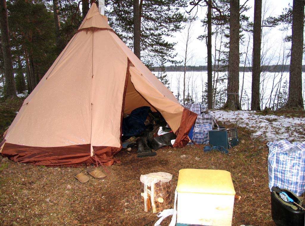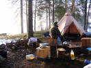 Для стоянки стараемся выбрать места удаленные от дорог и людей. В Карелии практически у любого рыбного озера есть избушка, если не свинячить можно остановиться и в ней, но гораздо интересней поставить навес или палатку. Коврики, спальники, большой костер или буржуйка, жить можно. Спать на земле просто немного необычно и если все правильно организовать, то совсем не холодно. Тем более, если за день на свежем воздухе натаскаешься, не надо ничего особенного, снять обувь тяжелую, сытно поесть, горячий чай, немного алкоголя, сигаретку и много разговоров. Кайф.