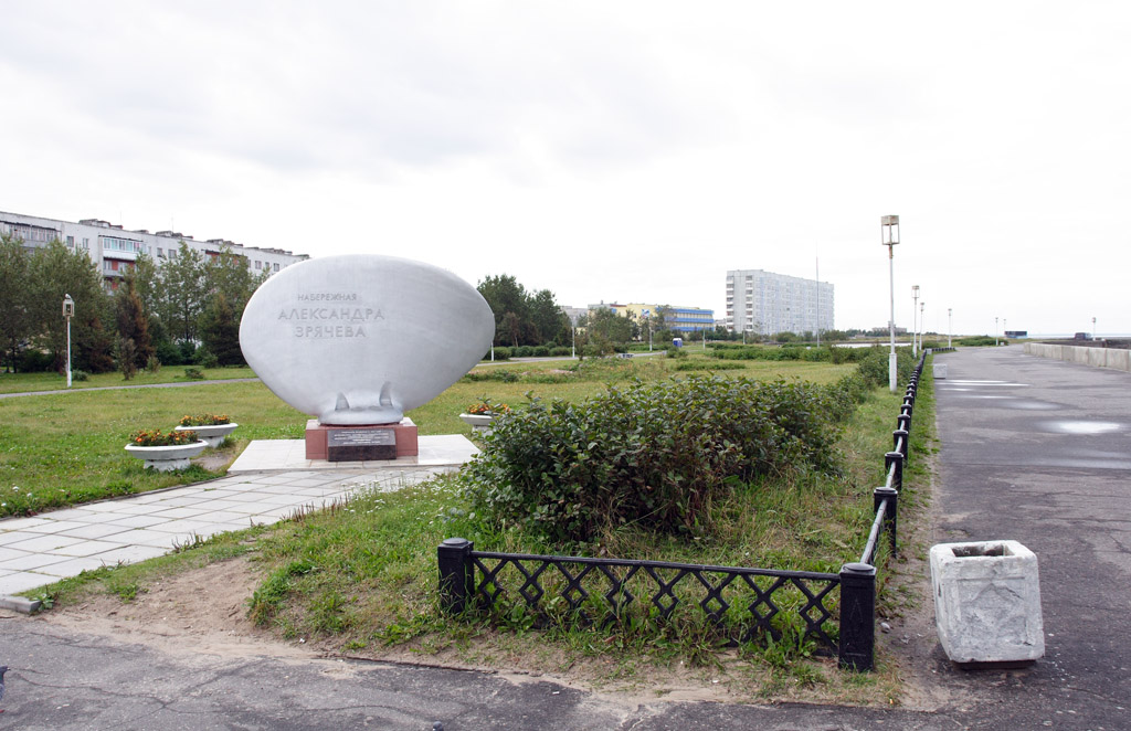 Северодвинск (с 1957 года) стоит на уникальной многометровой искусственной «подушке». Недостатка в людях не было и буквально за 30 лет отгрохали современный промышленный центр. Есть чем гордиться, судостроительные эллинги вошли в книгу Гинесса, в один входит несколько Исаакиевских соборов или 5 футбольных полей. Заводы «Севмаш» и «Звездочка», производство атомных подлодок, а сейчас и морских буровых установок. Город большой, 240 тысяч, очень высокая квалификация работающих, сплошная промзона, смотреть не на что, скучно как-то. Фотографий мало, да и нехорошо ходить по военному городу с фотоаппаратом. Проехали, поглазели, зашли в два магазина, полный полки, все есть. С моста видели в бухте «изделия», очевидно старые. Кому интересно посмотрите из космоса, забавно.