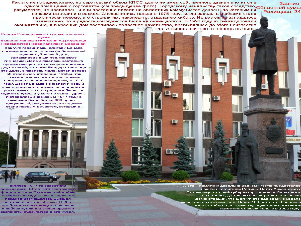 «В деревню, к тётке, в глушь, в Саратов!» сказал в 1824 году Грибоедов и как приклеил. В принципе, тогда так оно и было. Впоследствии Саратов неизменно набирал вес. Как в царские, так и в советские времена. После 1991 года, как (имхо) и все остальные российские города, за исключением обеих столиц, провалился в приличную задницу и надолго в ней остался, начав потихоньку выбираться только последние несколько лет. Во всяком случае, так кажется со стороны. До процветающих западно-сибирских центров нефтедобычи ему, конечно, далеко. Но живёт, строится, и даже исчезнувшие было дороги появились вновь, что не может не радовать.