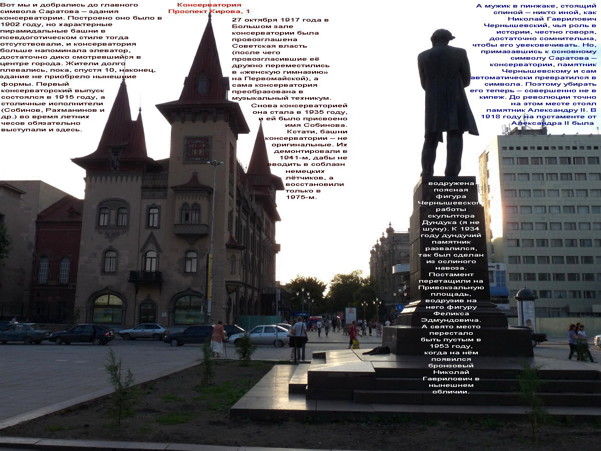 Блять респект охуенный! Вот это отчет! Для меня - так ваще ностальгия сплошная, я ж детство до 15 лет провел в Саратове. До 1985 г. жил там. С тех времен, кстати, город не особо принципиально изменился. Проспект Кирова, разве что. Да еще советские гербы-флаги поснимали с горсовета. Спасибо за отчет!