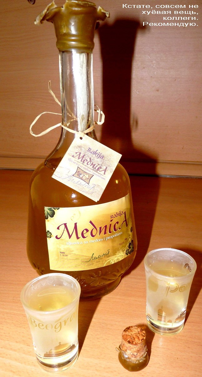 Водка. Пить сербскую ракию конечно прикольнее, чем скучную русскую водку. Но голова с неё потом раскалывается – мама не горюй. Хотя, может оно и правильно? Не будешь много пить.