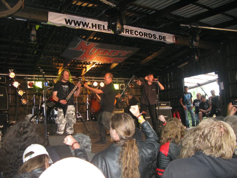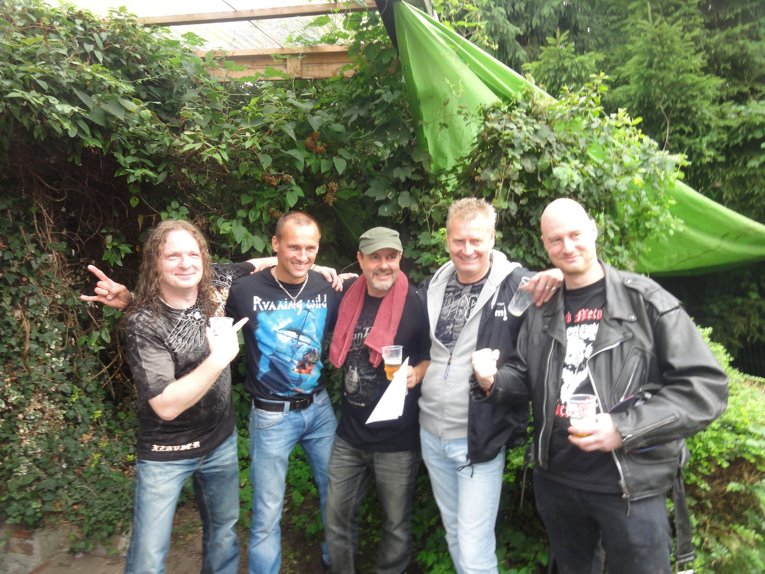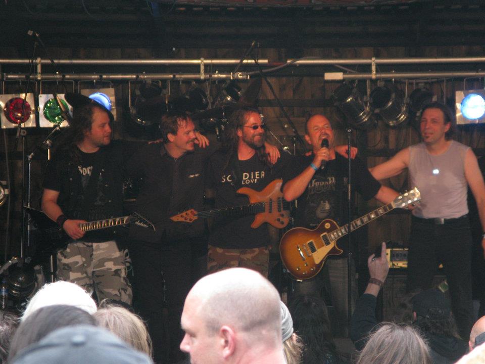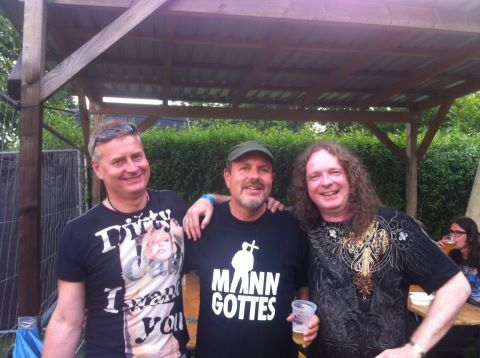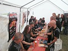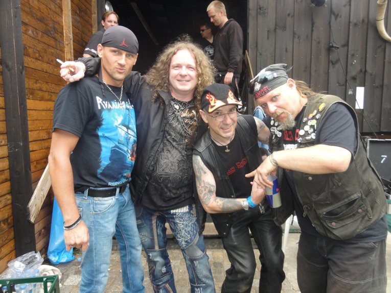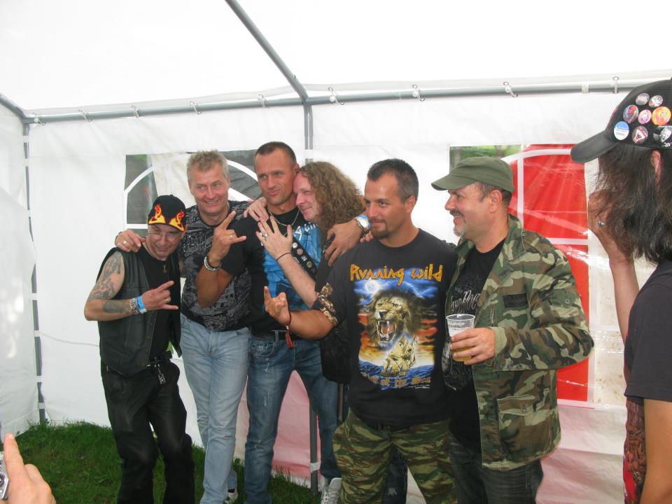 после того как завершили концерт, к нам подтянулся Стефан Борисс (ex bass Running Wild) со своей нынешней женой ...я собрал гитары Причера, после чего присоединился к банде....мы немного пофоткались вместе и врозь, и отправились на katering zone на пивко...Там к нам присоединился один старый друг RW с 3 альбомами фоток, которых никто из нас не видел, мы с удовольствием все вместе смотрели, ржали от комментариев Хаше и Стефана ))))было весело...тогда же на территорию заехал бус Тенкарда, и Хаше пошол поприветствовать Герре , с которым они большие друзя...(вообше Хаше поразил меня своей известностю и уважением, все его знают, все любят - душа человек).. я вывалил свои винилы на стол, которые мне любезно подписали....потом нас позвали на автографф сессию с фанатами (меня потянули тоже ))))