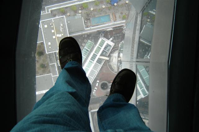 Тут телебашня с прозрачным стеклянным полом на обзорной площадке. Заставить себя встать на это стекло двумя ногами, не за что не держась - охуенно трудно. Так и кажется, что стекло под тобой треснет нахуй и ты улетишь в эту пропасть ...
