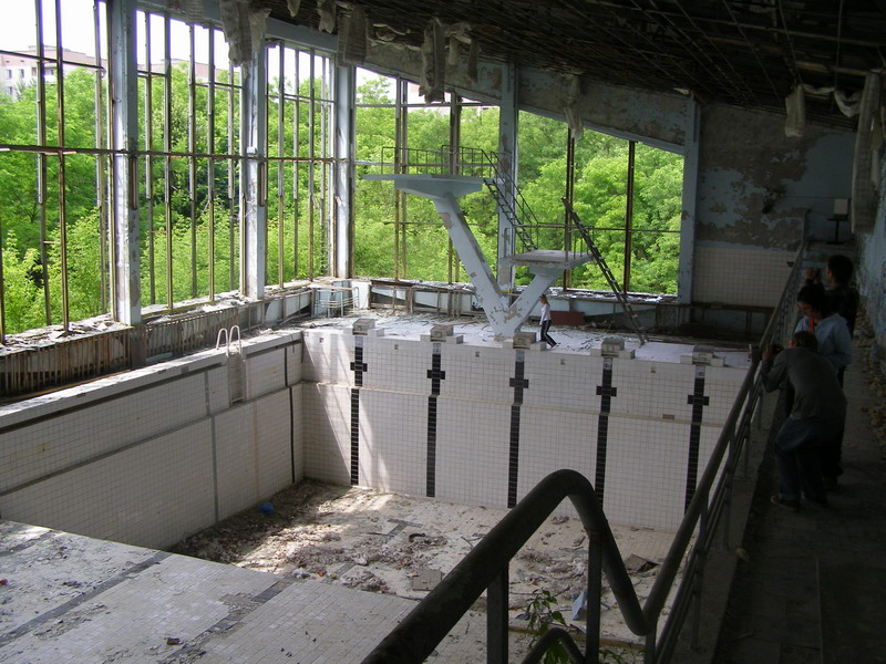 На самом деле заброшенный город производит довольно гнетущее впечатление. Это сейчас летом там «джунгли наступают». А вот зимой или осенью наверно вообще жуть. Основная разруха конечно не от взрыва, как думают наивные иностранные туристы, а от мародеров. По слухам даже среди экскурсантов есть любители покидать унитазы в шахту лифта. Это у нас группа попалась спокойная и не пьющая. А вот воруют оттуда железо, например. Срезают батареи и т.д.