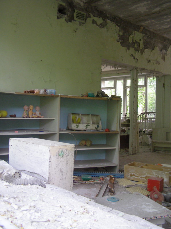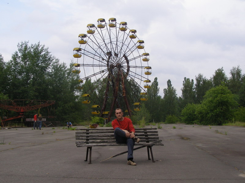 В Припяти я присел на скамейку сфоткаться. И только потом решил замерить, сколько там было. А было 100 микро рентген. А еще мертвый город живет своей жизнью. Духи властвуют в нем. Возле чертова колеса маленький разбитый луна-парк. Там есть такие лодочки. Знаете качели такие? Лодочка довольно тяжелая – один не утащишь. беби Так вот одна такая лодочка лежит на крыше шестнадцати этажного здания. Затащить ее туда мягко скажем, проблематично.
