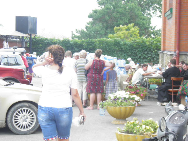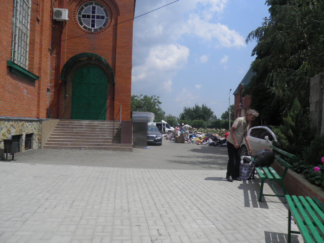 Подворье Собора Михаила Архангела завалено одеждой для пострадавших.На заднем плане спряталась машина НТВ.
