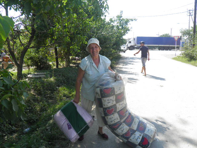 Пострадавшим раздают матрацы,подушки,простыни и одеяла.Помог этой бабушке донести до дома,потом сходил с ней и принёс раскладушку.