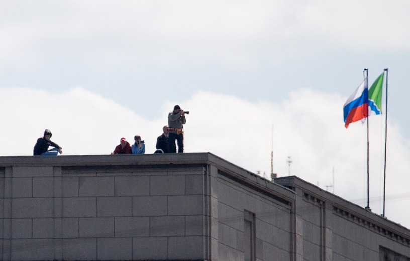 38. Некоторые фотографы просочились на крышу мэрии. Им хотя бы не пришлось отбивать место для съемки на вазоне с землей, снимать в таком контровом свете и на таких жестких зумах, как мне.