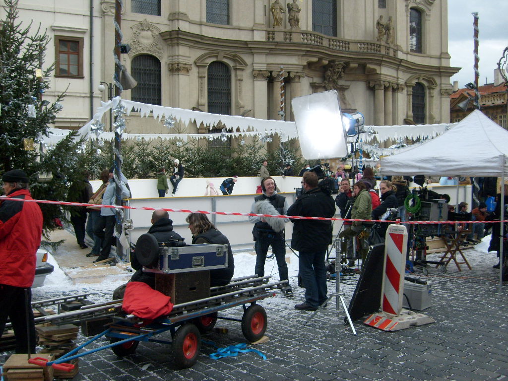 Едва мы завернули за угол какой-то улочки, как под ногами снова показался снег. Да какой крупный! Я даже удивился, снег сыпался как крупа, большими и твердыми шариками. Но, едва наступив на него, я начал смеяться, пражанам явно не хватало снега, это были ошметки от пенопласта. Оглядевшись, я увидел огромную толпу народа, с кинокамерами, несколько громадных трейлеров и, пробившись сквозь толпу зевак, увидел, что снимают какое-то кино. Люди на катке, как пластмассовые игрушки с картинными лицами катались по льду, изображая на своих личиках радость, чувак с огромным волосатым микрофоном пытался поймать текст. А пурга из искусственного снега, смешиваясь со снегом, придала настоящий зимний вид катку посреди улицы. Люди с серьезными лицами ходили вокруг катка, кто-то кричал в мегафон, суетились осветители, а за трейлером пара людишек, бомжеватого вида, воровато ели что-то из одноразовых боксов.