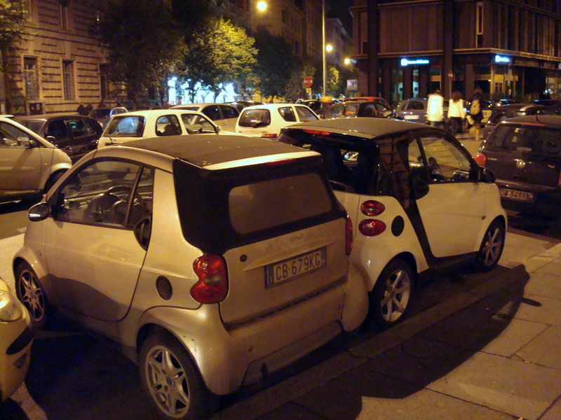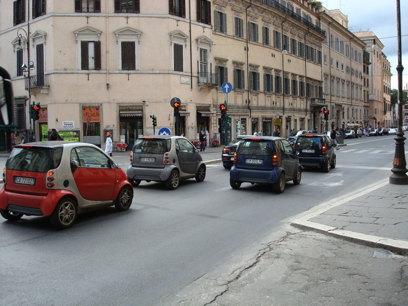 Зато мощёные улочки, напрочь лишённые тротуаров, и потому труднопроходимые не только для пешеходов, но и для больших машин, узкие шопиздец. Ездят там, в основном на малюсеньких авто. Поэтому ночью Рим превращается в одну огромную стоянку микромашинок, вплотную припаркованных друг к дружке