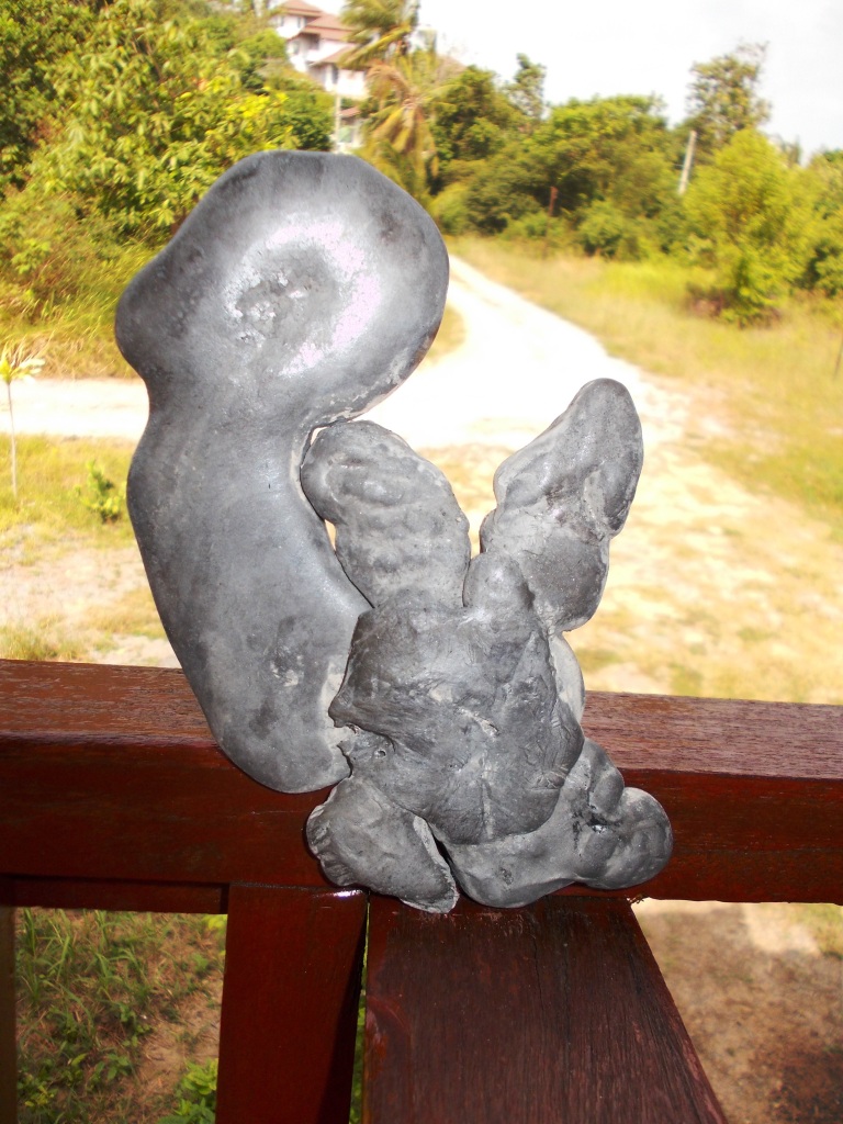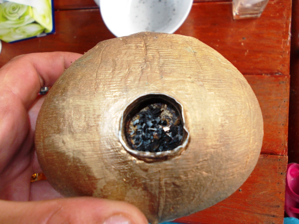 На обеденном столе легкий творческий беспорядок со вчерашнего – в т.ч. и очередной мой hand made бурбулятор «Бедный Йорик», по здешнему – бонг. Сработан из местного кокоса и православного креста сандалового дерева, привезенного подругой Веруськой аж из самого Иерусалима (и та религия мне тоже по барабану. Однако ж, попадаются клоуны, которые из этого бонга курить опасаются – надо полагать, чудится им в том кощунство, мегеге).