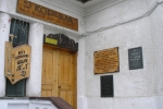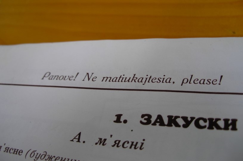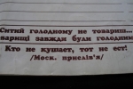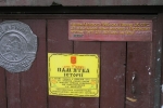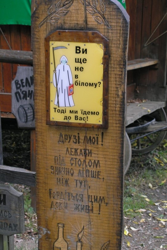 При в ходе на территорию (ресторана?) мы видим табличку «охраняется пьяницами» и «деца у нотаря – воспоминание о древних временах». (1)