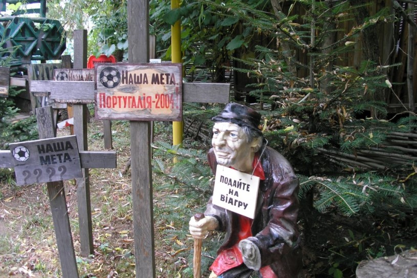 Вот и начну пожалуй с рыгаловок типа «три дубка». В Ужгороде (обл. центр Закарпатья) есть замечательное место, где можно отдохнуть, познакомиться с местной кухней, удивиться необычным интерьерам и экстерьерам. Могу сказать, что другого такого места на Украине б/п нет. Называется этот объект «Деца у нотаря», что в переводе с хз какого языка означает «сто грамм у нотариуса».