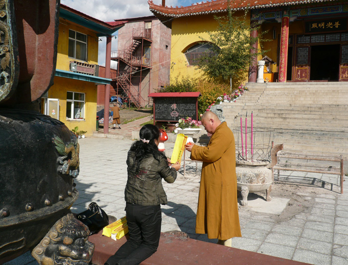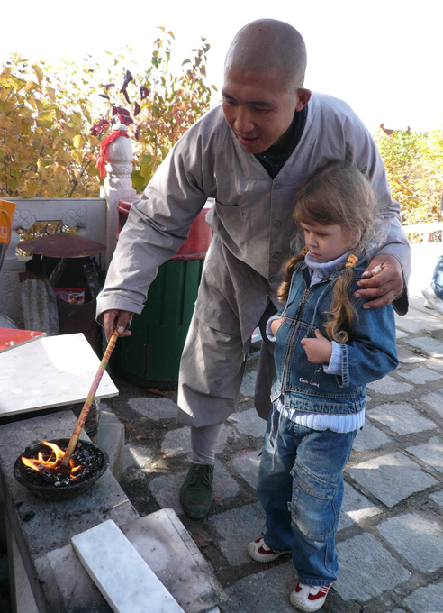 Именно так звучит это имя по-китайски.  Поехал на выходные побухать к соседям, зашел, как всегда, в храм. Хуле, чань-буддизм, как мы его видим, и все такое.  Самое ценное когда едешь в Суй Фэнь Хе , это дьюти-фри на границе и монастырь на горе (5 юаней таксисту и ни копейкой больше!) Туристов стало гораздо меньше, это хорошо. В монастыре ваще никого не было. Тихо, колокольчики на ветру звенят. Сунька (так называют этот городишко во Владивостоке) разная на самом деле, не только кабак и торговая лавка. Ездил, к слову, с дочей. Тварчюшка, разумеется, кланяться никому не стала, но «палочки для дыма пусть зажгут, это прикольно».