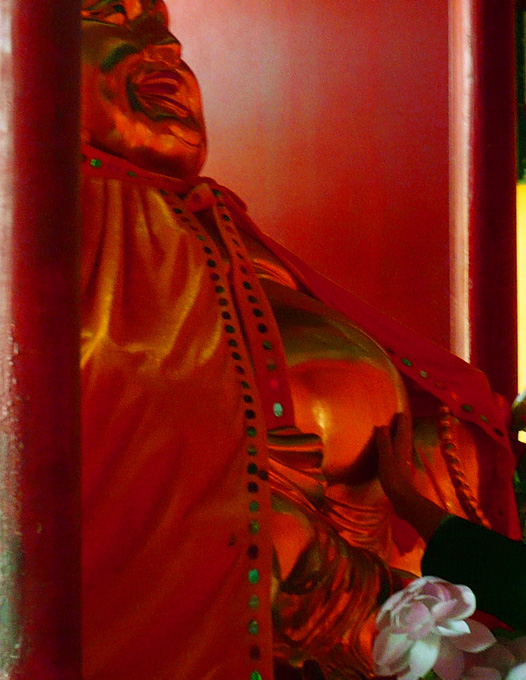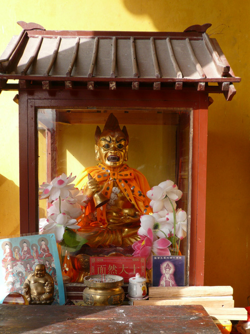 В одном из храмов – смеющийся Будда, китайцы зовут его Фо. Надо погладить по пузу, и желание сбудется. Под навесиком – Князь Тьмы, Зло. Он существенно отличается от христианского дьявола, натура противоречивая, скорее похож на Сета. Перед ним тоже свечки и подношения.