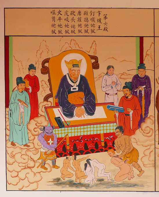 В пагоде на отшибе весь пол оказался усеян божьими коровками. Туда входить не разрешили. Буддисты – хуле. На стенах – картины, здорово напоминающие «Страшный Суд» - сидит на облаках какой-то чувак, а кнему грешников тянут. На первой перед алтарем почему-то блондинка с хорошей задницей, явно не китайского происхождения.