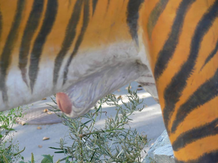 У кинотеатра «Океан», метрах в ста, к морю, там тигр консервативный, без причиндалов. К нему мамы детишек водят фотографироваться. А к этому – нет. И правильно! Нечего детей пугать, ссаться будут. Свирепое выражение лица у цветной тигры, «для взрослых».