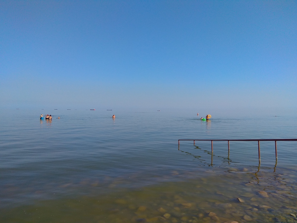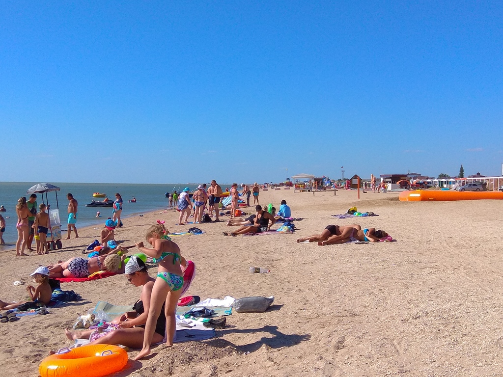 Море и пляж это отдельный разговор. «Лужа»? Соглашусь, Азовское море мелкое, но в этом и его преимущество: вода настолько теплая и комфортная, что в ней можно сидеть часами, не боясь переохладиться. Вода чистейшая, никакого мусора, как на Черном, вроде окурков, пластика и фантиков не плавало, изредка попадались только птичьи перья. У воды своеобразный желтовато-зеленый цвет. Зачерпнешь ее в пригоршни- прозрачная, но видимость в ней сантиметров на 15 в глубину. Говорят, в воде растворены полезные иловые грязи. У берега плавают стайки рыбок. Мы знали, что море мелкое, так что никаких неприятных открытий не было. Дочь из воды почти не выходила, я боялась, что у нее русалочий хвост отрастет. Да и сама я ленилась плавать, находила песчаную отмель и стояла на коленях, покачиваясь в теплых зеленых волнах, подставив лицо солнцу. Так что нет, не лужа, мягкое ласковое море.