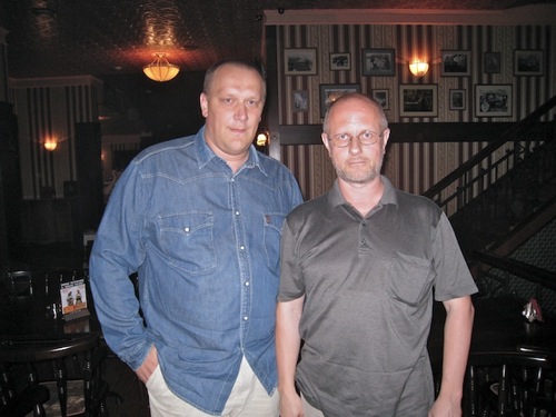 Кстате, я как увидел первую картинку, на долю секунды мелькнула безумная мысль, что изображенные на ней мужики имеют какое-то отношение к съемкам этого кено, м.б. даже к исполнению ролей Бруно и его друзей, блин, падахуел, канешна. Потом, опять-таки за доли секунды, дошло, что мужык слева - Удав, а еще через секунду - что мужык справа - Пучков. И крыша вернулась на место. Стало ясно, что автор просто сфотографировался с известным кино-переводчиком на память, так сказать. Помутнение сознания и его просветление продолжались одно мгновение, но фсё-таки по голове немного ёбнуло от такого контраста.