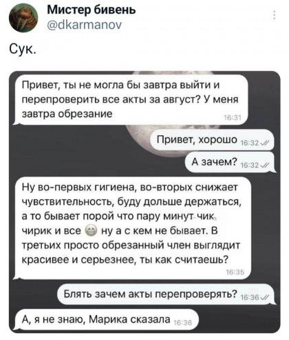 «Вначале она прикусила мой хуй, который находился в этот момент у нее во рту, сжала мне яйца, за каким-то хером еще и пизданула по ним (шоп жисть медом не казалась), вытащила мой хуй изо рта, заорала, вытащила резиновый хуй из песды, не прекращая орать, посмотрела на него и – венец всего – пизданула мне этим куском резинового Рокко Сиффреди по ебалу.»